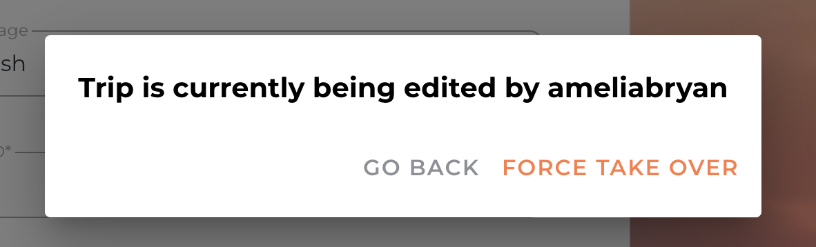 If you try to edit a trip that another person is editing or has open, you’ll see a notification like this: