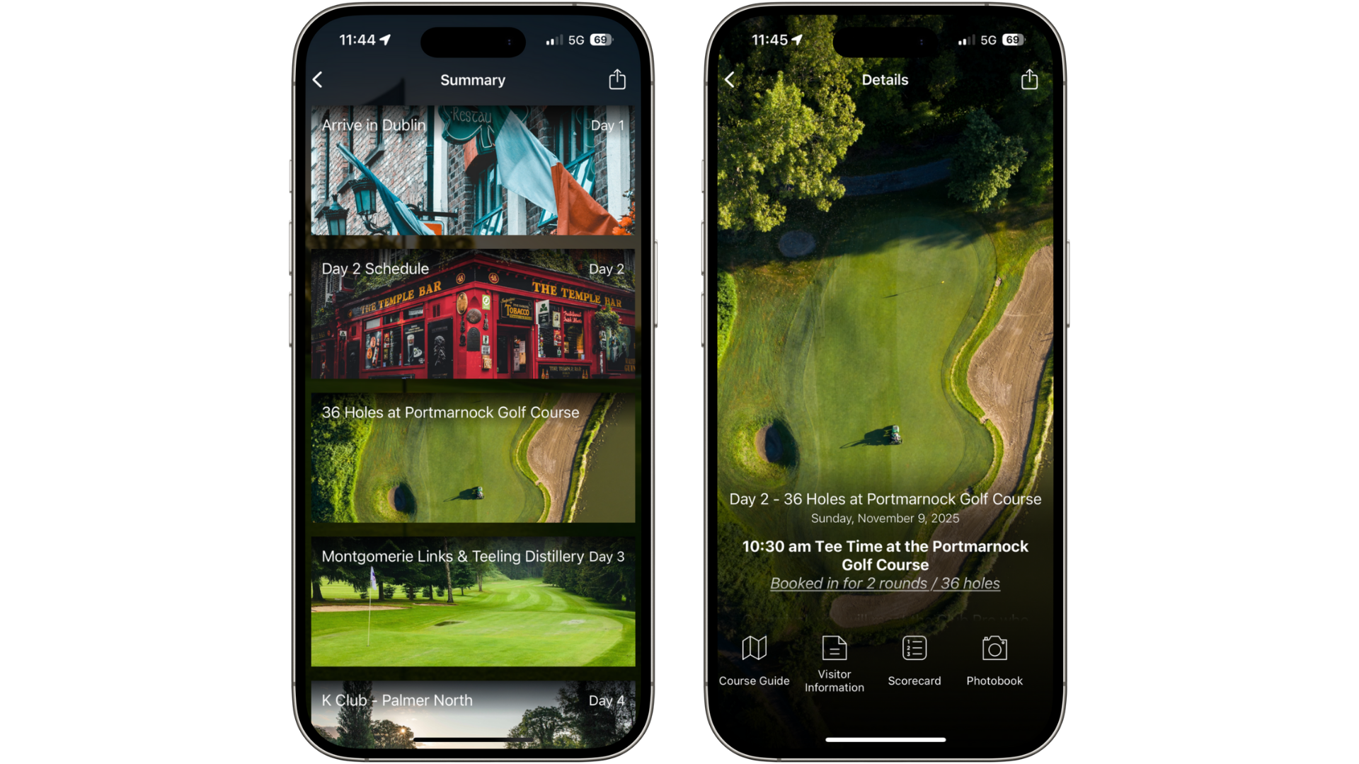 Example: The night before each tee-off (8–9pm), remind clients of tee times & locations. On the morning of, send a final reminder 1 hour before with a link to the course guide.