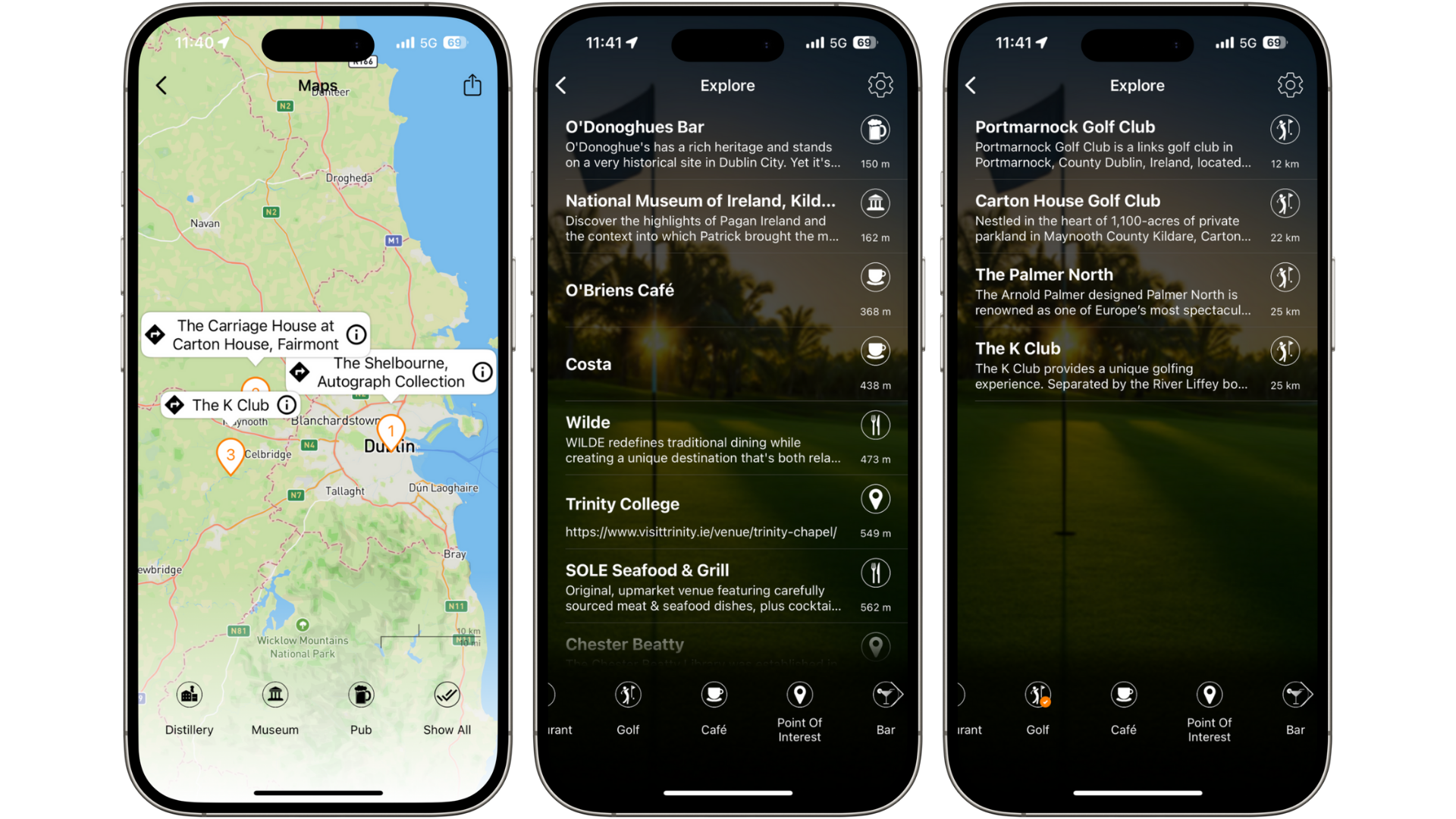 The most important POIs are golf clubs and courses. Select the Golf icon, link to the course website, and let clients filter Maps & Explore for golf locations only.
