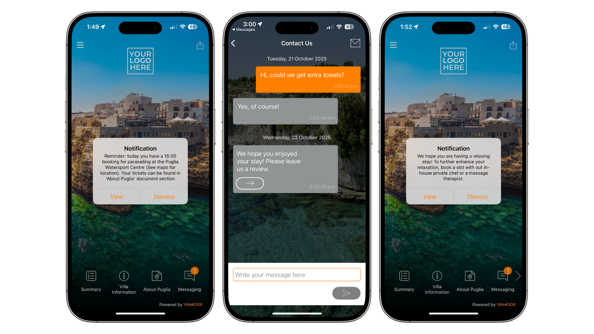 While at the villa, send reminders about extra services (chef, spa, etc.) with booking links.