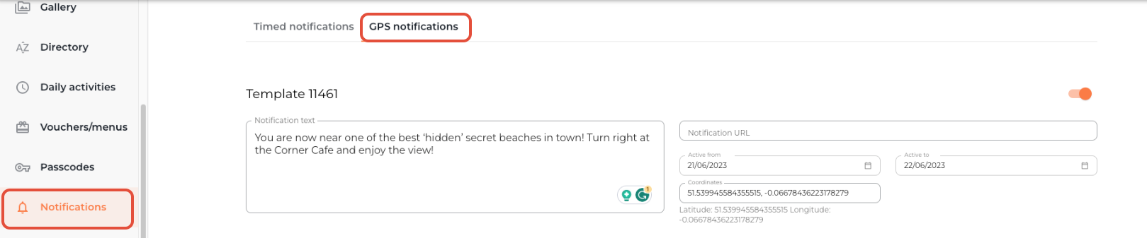 GPS Notifications – trigger a message when a guest comes within 1km of a set location.
