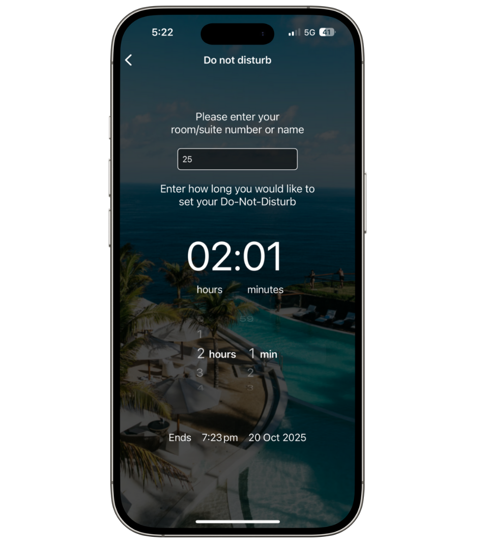 They will be able to insert their Room Number/Name and request an amount of time they would like to set their DND for