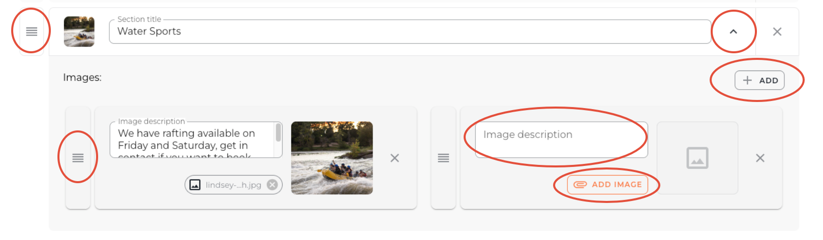 Reorder sections and images with the drag-and-drop (3 lines) tool.