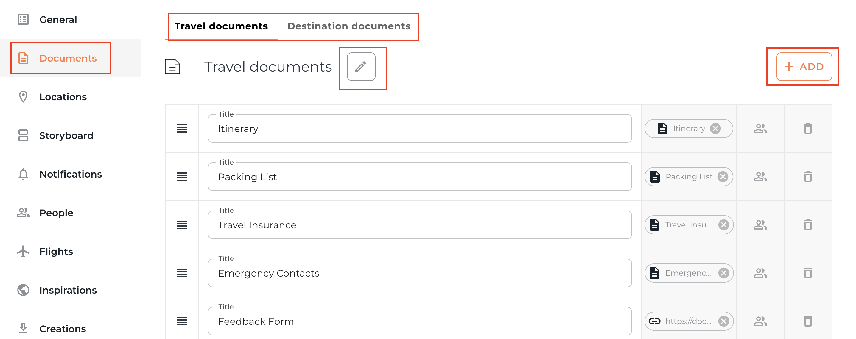 There are 2 default sections: Travel Documents & Destination Documents (you can rename these).
