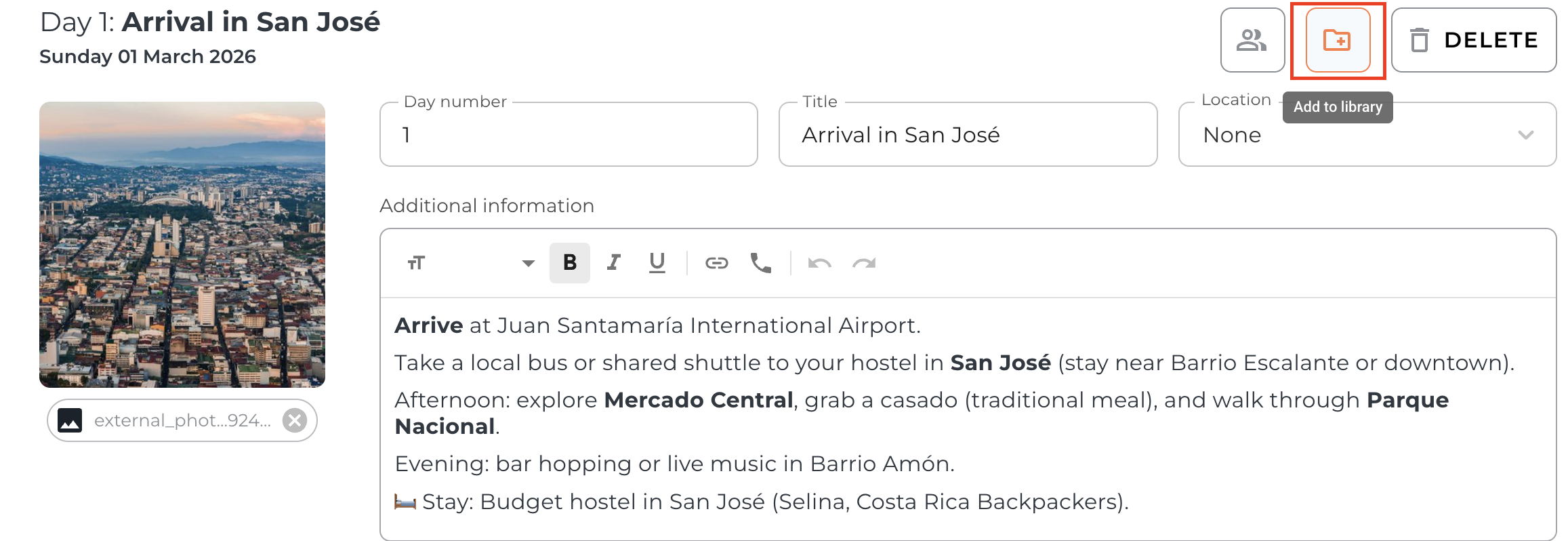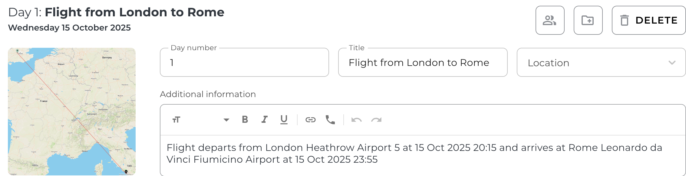 Documents: Add day-specific documents or links (e.g. e-tickets, background reading, playlists, confirmations).