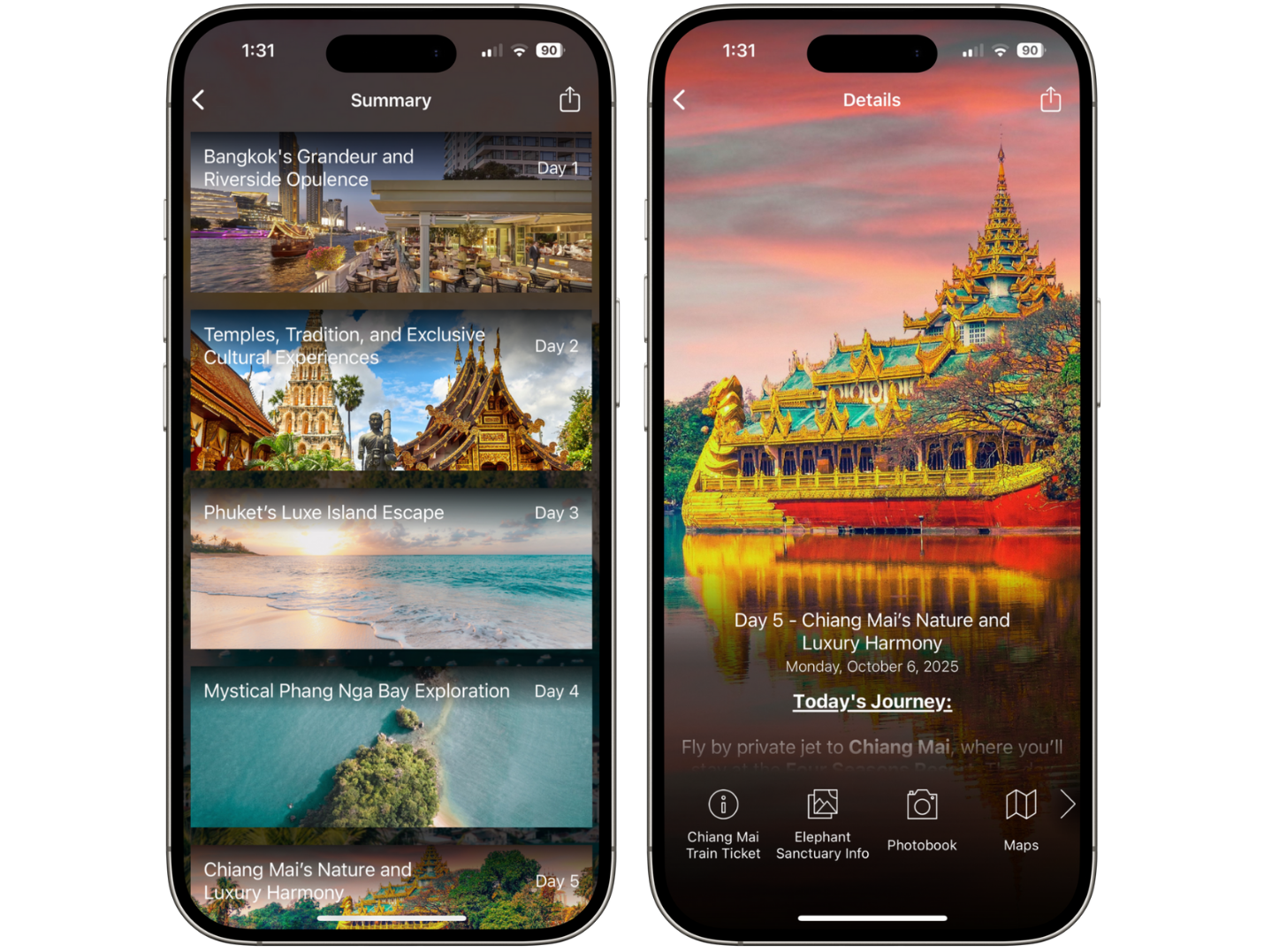 Detailed View: This provides a detailed view of a specific day of the itinerary. The user can see full information relating to that day (right screenshot).