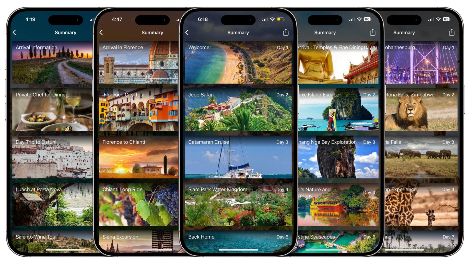 Summary View: This presents the content in an image-led list. It will provide a visual overview of the itinerary for the user showing just day titles & numbers (left screenshot).