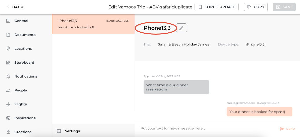 Due to privacy reasons Vamoos cannot track traveller names, therefore the in-app messaging feature only identifies device type — not traveller names.