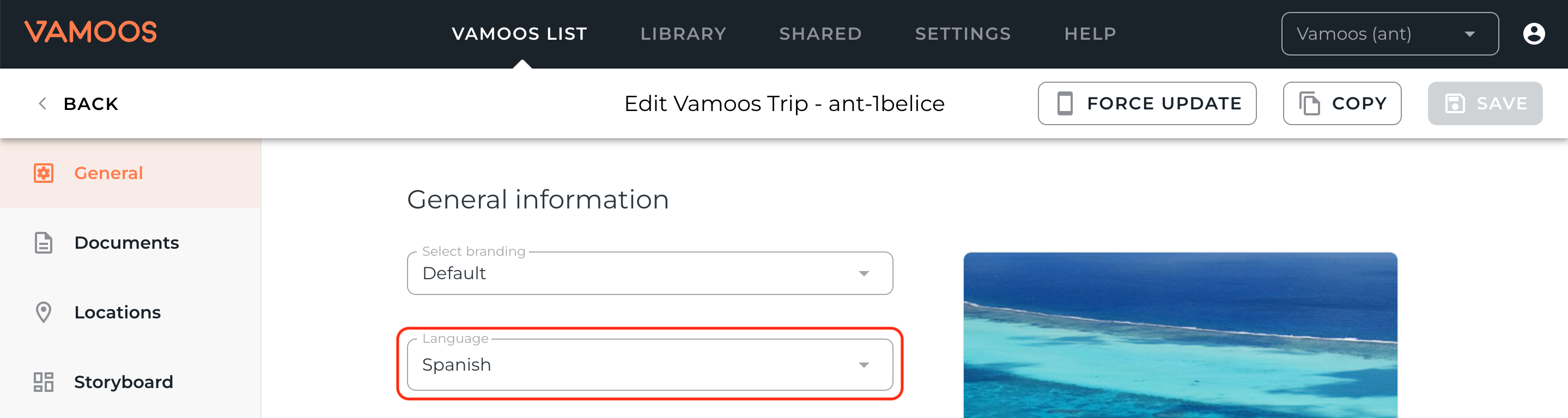 In Vamoos List > Vamoos Trips, create or duplicate a trip. Under General, select the trip’s language from the drop-down.