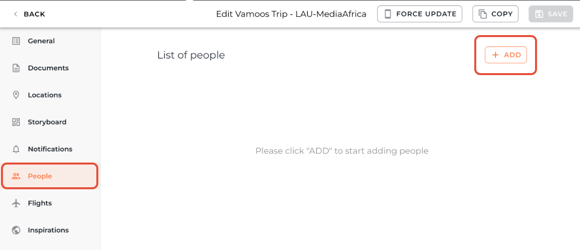Select (or create) your trip in the Vamoos List and go to the People section.