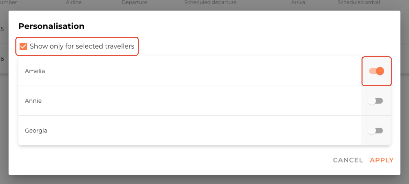 You can personalise Flights, Documents, and Storyboard items to control what information and content individual travellers have access to.