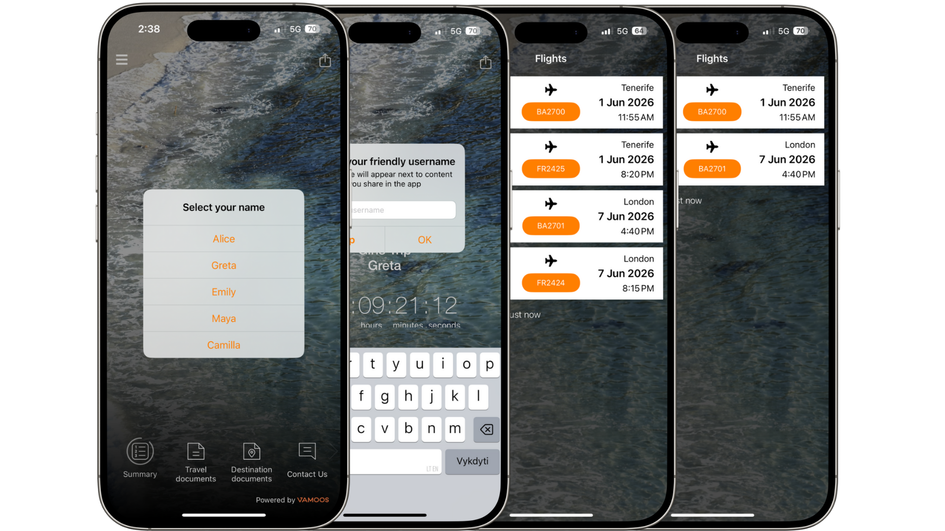Once personalisation is set, travellers log in to the app and see only their own trip information.