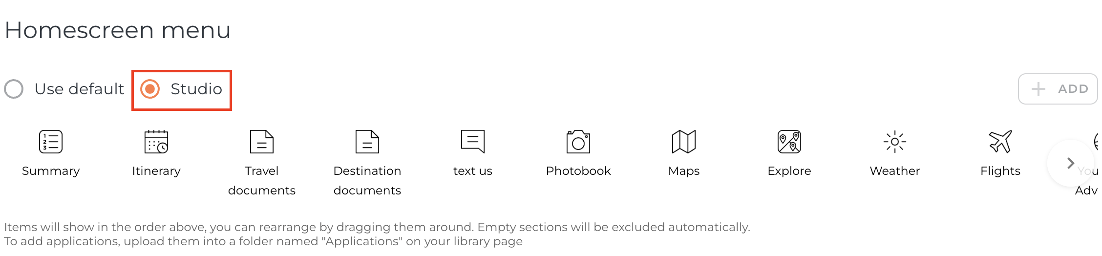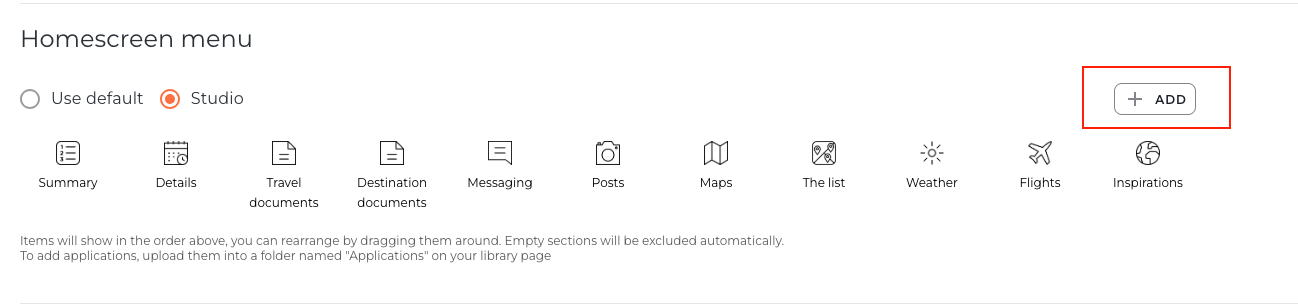 Keep the Default option if you would like to maintain the standard Home Screen Icon Menu order, or select Studio if you wish to rearrange the order of the icons in the app across your trips.