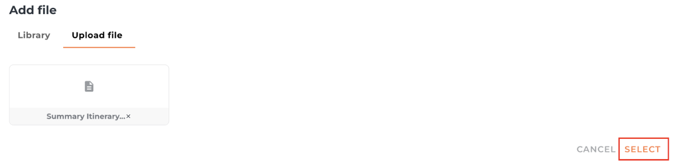 In order to upload and convert the PDF document into a Vamoos trip, you will need to click on the TRIPIMPORT button at the top right hand side and choose to upload the PDF from the Library or upload from your device and click SELECT.