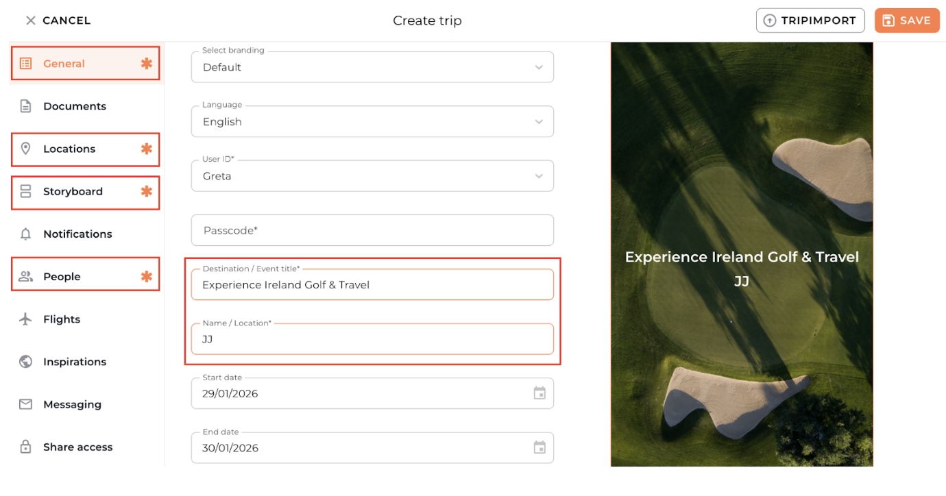 Any sections created by TripImport will be highlighted in red and contain a red asterisk in the left-hand side menu, so it’s easy to see what needs reviewing.